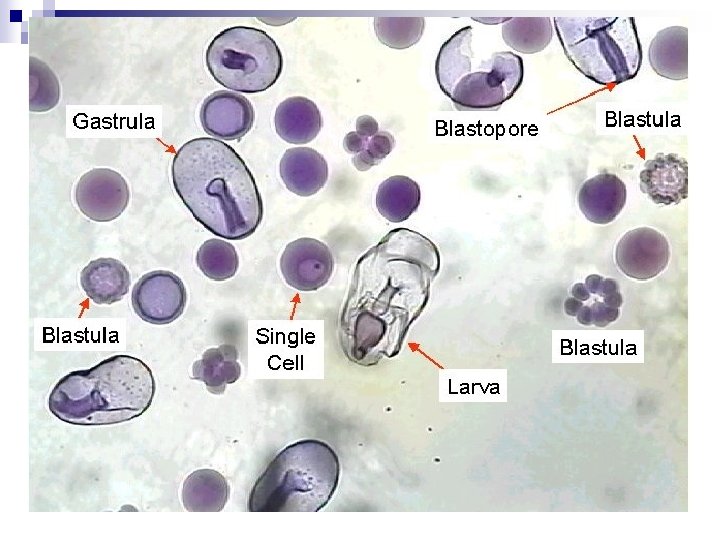 Reproduction and Development n Primarily sexual (but some asexual) ¨ n Sperm and egg Zygote grows by many mitotic divisions Called cleavage ¨ Zygote to blastula to gastrula (usually in egg) ¨ n n n ¨ n Gastrulation: http: //www. youtube. com/watch? v=1 Mnw. HRURKns http: //www. youtube. com/watch? v=j 87 y 7 EAj 8 q. E http: //www. youtube. com/watch? v=8 v 6 c. Xkzl. EQA Larva to adult by metamorphosis Same gene to regulate expression (Hox gene)