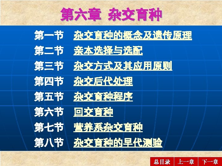 第六节 回交育种 Backcross Breeding 一、回交育种的概念、特点及意义 Concept, particular characteristics and significance of backcross breeding 二、回交育种的基本遗传规律 Basic genetic principle of backcross breeding 三、回交育种程序 Procedure of backcross breeding 四、回交育种的技术 Main rules & techniques in backcross breeding 章目录 上一节 下一节