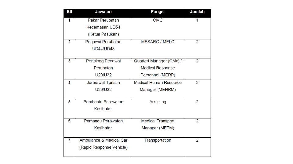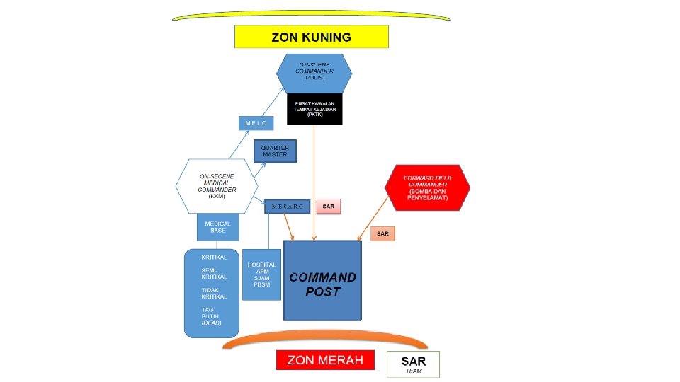 Organization of MOH staff at incident site 1. On site medical commander (OMC) 2. Medical search & Rescue officer (MESARO) 3. Medical liaison officer (MELO) 4. Triage officer 5. Logistic personnel 6. Transport personnel