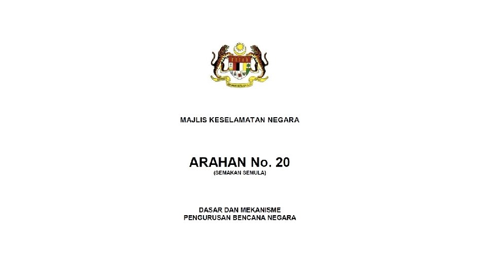 Directive 20, National Security Council • was created on 11 May 1997 by the National Security Council (MKN), the Prime Minister 's Department following the collapse of the Tragedy of Highland Towers Apartments in Hulu Klang, Selangor on 11 December 1993. • aims to outline overall disaster management policies and mechanisms including the roles and responsibilities of Government Agencies, statutory bodies, private sector and voluntary bodies covering the pre -, during and post-disaster level