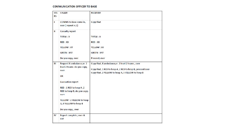 Set Up Base • • Inform the on scene incident commander (usually the police) Send a liaison officer to the control post Identify the codon Set up medical base at yellow codon Set up triage system Set up decontamination area Set up drop zone