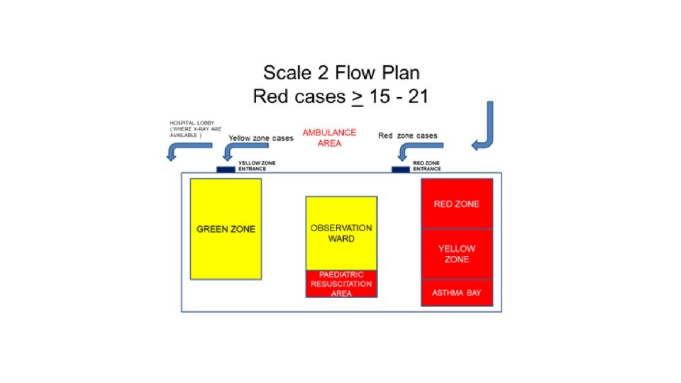 Scale 2 • When critical victims reach 15 people and / or semi-critical victims reach 16 people • The critical zone is the combination of the red zone and the yellow zone while the semi-critical zone is the Observation Ward which can have 16 beds. • For non-critical patients, they will be treated at the Lobby of the twin tower building or at the Pre-Hospital building