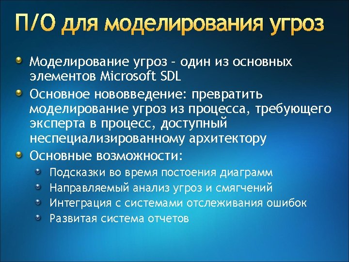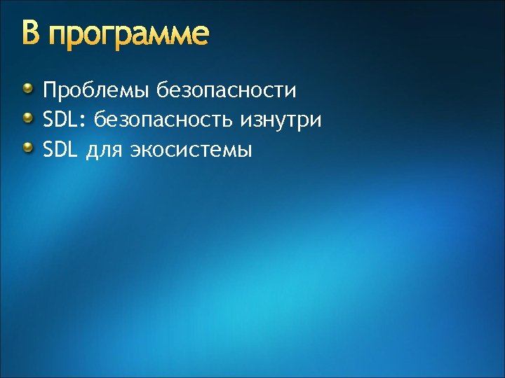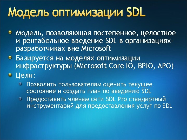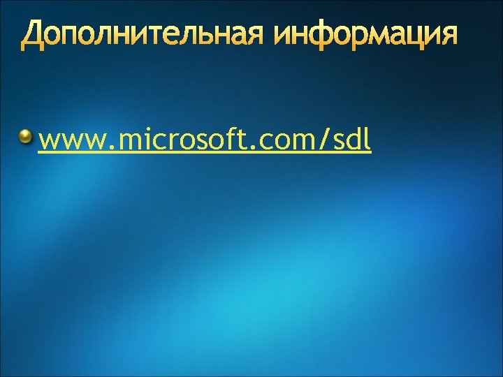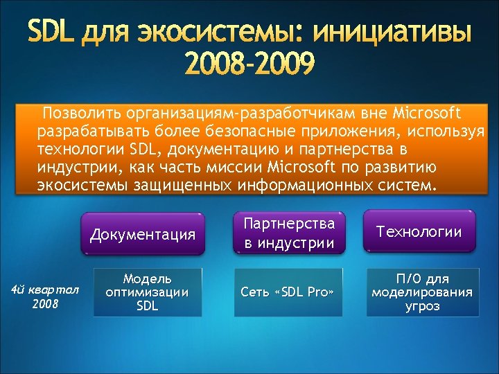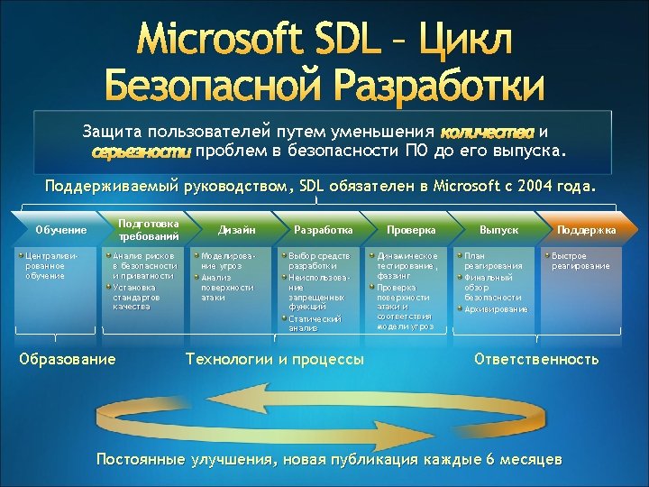 Эволюция SDL v. 3, v. 4 SDL @ Microsoft • Privacy requirements • Online services requirements SDL v. 2 SDL mandatory for all packaged SW with meaningful risk SDL v. 1 • SDL Optimization model • SDL Pro network • SDL threat modeling tool Security push for major products SDL process guidance Tw. C memo Privacy guidelines SDL book SDL for the ecosystem SDL whitepaper 2002 2003 2004 2005 2006 2007 2008 2009