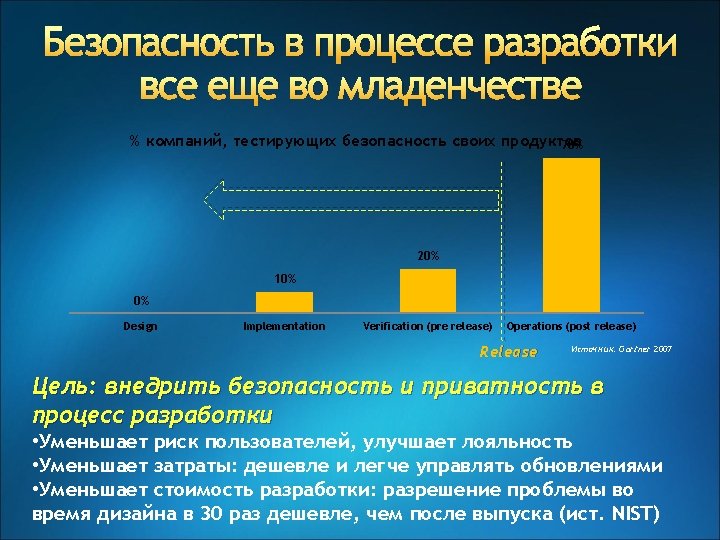 Microsoft SDL и Windows Количество уязвимостей, 1 год после выпуска До SDL После SDL 45% меньше уязвимостей Source: Windows Vista One Year Vulnerability Report, Microsoft Security Blog 23 Jan 2008
