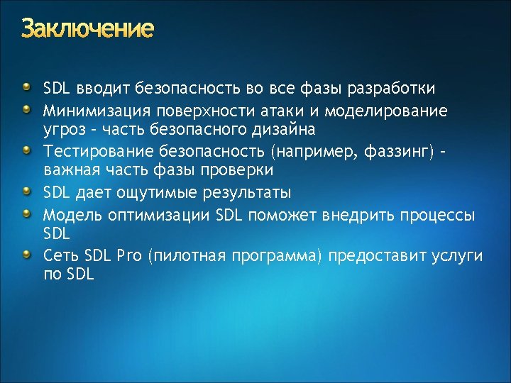 Security Development Lifecycle результаты “Microsoft has significantly improved the security of its shipping products since the adoption of its security development life cycle. The first OS product to ship since Microsoft adopted its SDL was Windows Server 2003 (with IIS 6). Windows 2003 has had sufficient operational testing to be suitable for security-critical applications” Neil Mc. Donald Group Vice President and Research Director Gartner, Inc (From Gartner Symposium May 2005)