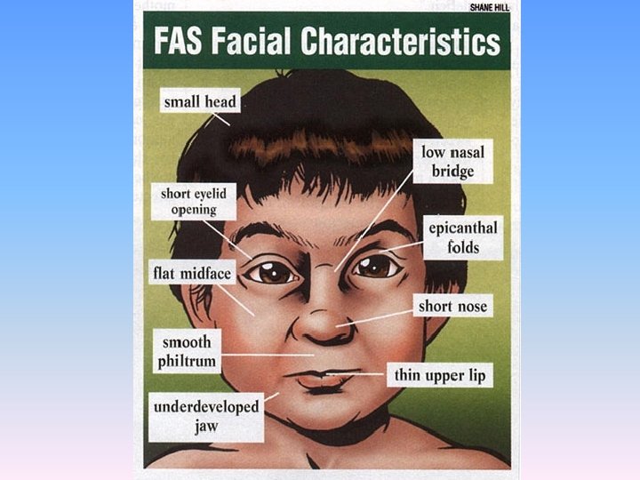 Fetal Alcohol Syndrome (FAS) • A series of physical and cognitive abnormalities in children due to their mother drinking large amounts of alcohol during pregnancy