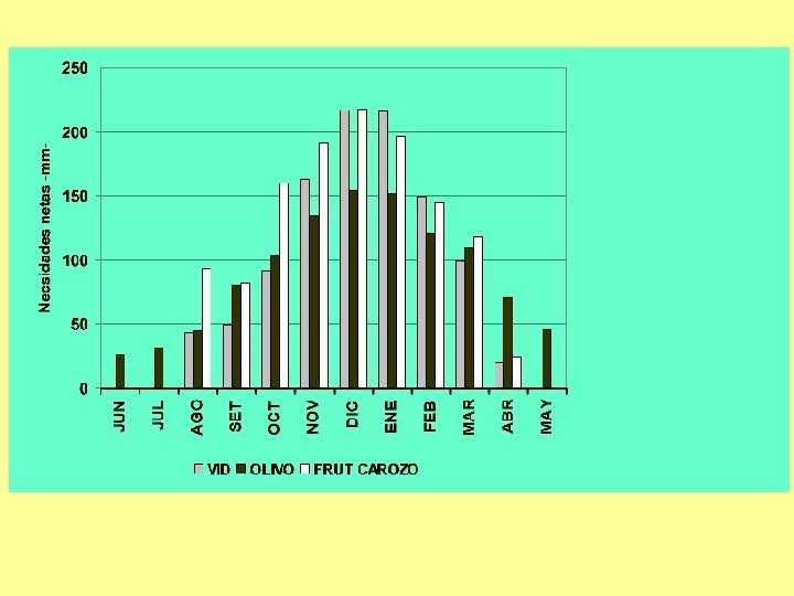RESULTADOS Necesidades de riego netas mensuales y totales para vid, frutales de carozo y olivo. Valles centrales. San Juan. (mm) Cultivo JUN JUL AGO SET OCT NOV DIC ENE FEB MAR ABR MAY TOTAL Vid 43 49 92 99 20 1049 Frutales de Carozo 93 82 160 191 218 196 145 119 25 1229 45 80 104 134 152 121 110 71 Olivo 26 31 163 217 216 150 45 1072