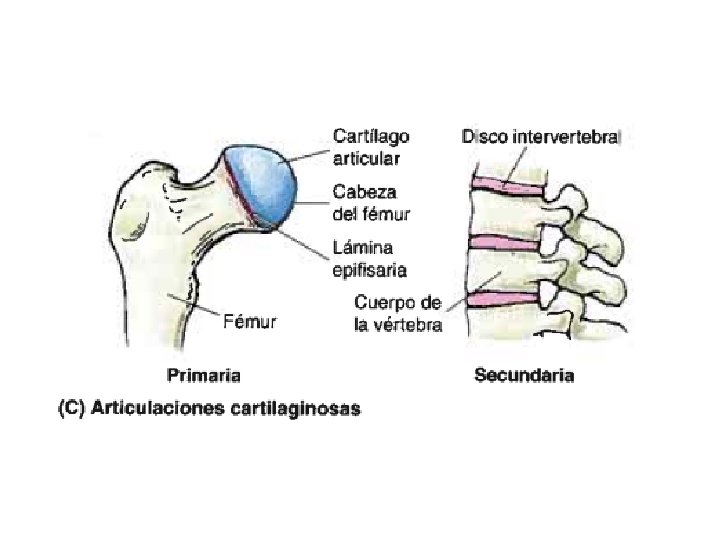 CARTILAGINOSAS • Se unen mediante cartílago hialino o fibrocartílago: – Cartilaginosas primarias (sincondrosis): • Huesos unidos por cartílago hialino • Son uniones temporales, por ejemplo en el desarrollo de un hueso largo (placa epifiseal) • Permiten el crecimiento longitudinal del hueso – Cartilaginosas secundarias (sínfisis): • Articulaciones fuertes ligeramente móviles • Unidas por fibrocartílago – Ej: Discos intervertebrales