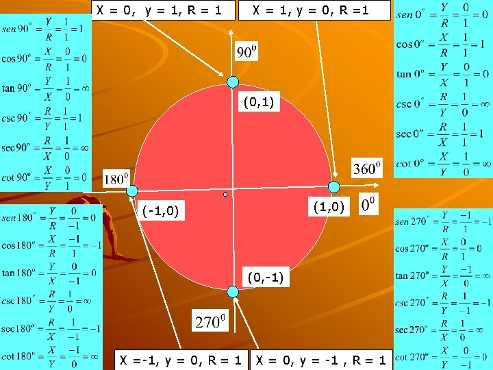 FUNCIONES DE ÁNGULOS DE CUADRANTE Procedimiento para determinar las Funciones de ángulos de cuadrante Para determinar las funciones de los ángulo de cuadrante se debe dibujar un circulo trigonométrico de radio uno. Ubicando el radio vector en cada uno de los ejes o ángulo de cuadrante, podemos determinar las funciones de cada uno de estos ángulos considerando. que en cada eje el radio vector será igual al mismo cateto, siendo cero el cateto restante.