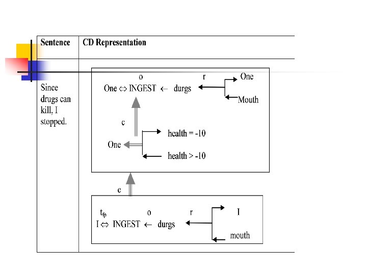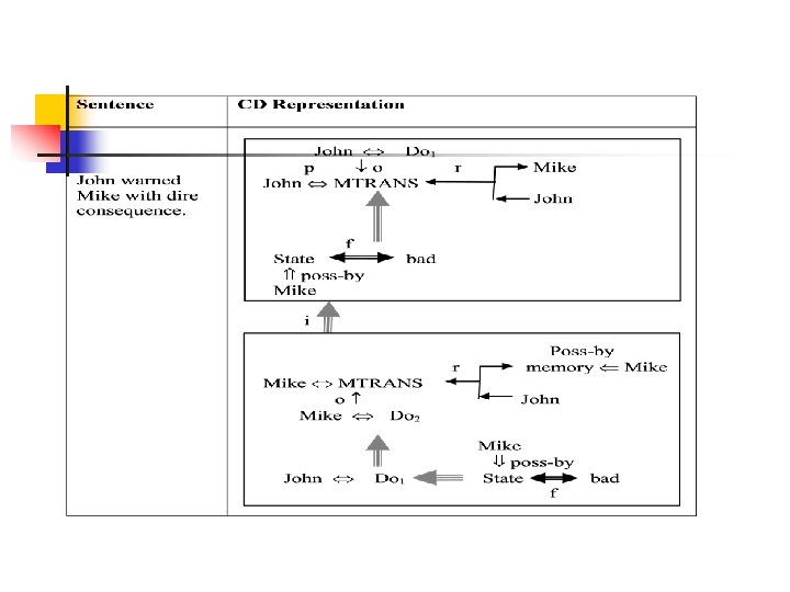Cont… ● Example: The verbs {give, take, steal, donate} involve a transfer of ownership of an object. − If any of them occurs, then inferences about who now has the object and who once had the object may be important. − In a CD representation, these possible inferences can be stated once and associated with the primitive ACT “ATRANS”. n Consider another sentence “Bill threatened John with a broken nose” − Sentence interpretation is that Bill informed John that he (Bill) will do something to break john’s nose. − Bill did (said) so in order that John will believe that if he (john) does some other thing (different from what Bill wanted) then Bill will break John’s nose.