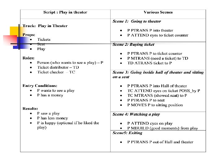 Script Components ● Each script contains the following main components. − Entry Conditions: Must be satisfied before events in the script can occur. − Results: Conditions that will be true after events in script occur. − Props: Slots representing objects involved in the events. − Roles: Persons involved in the events. − Track: Specific variation on more general pattern in the script. Different tracks may share many components of the same script but not all. − Scenes: The sequence of events that occur. Events are represented in conceptual dependency form.