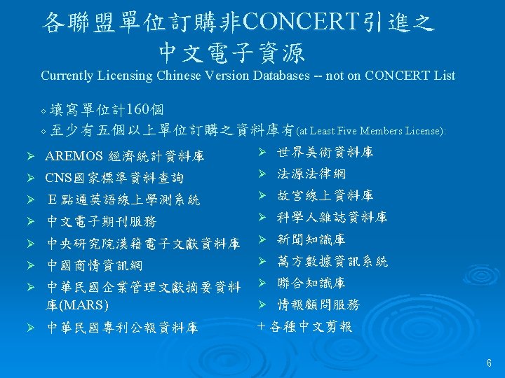 CONCERT對各單位之具體服務效益 Service Performance 降低電子資源採購成本 Lower Down the Cost of E-Resources 減少採購行政程序及人力Decrease Admin & Purchasing Human Resources 有效爭取最大使用權益 Effectively Strive for Access Right 協助瞭解計價模式 Assist in Understanding Pricing Model 提供資料庫諮詢服務 Provide Information Services 獲得資料庫廠商更好的服務 Get Better Services from Information Providers 5