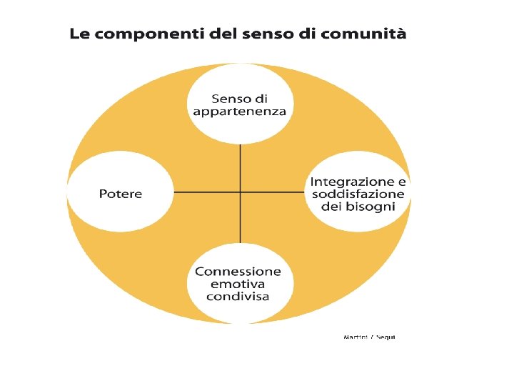 La costruzione di senso di Comunità • Il senso di comunità è un insieme di consapevolezza (livello cognitivo) e sentimento (livello emotivo-affettivo) di appartenenza alla comunità. • Questo costrutto esplicita il senso che i membri hanno di condividere con altri un’appartenenza comune, di poter essere importanti e influenti nella comunità, di poter integrare e soddisfare i bisogni attraverso lo stare insieme.