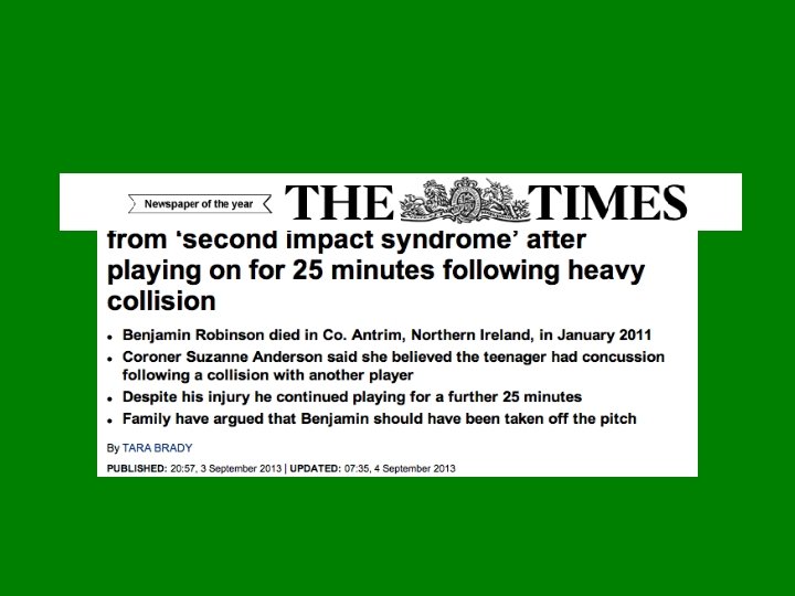 Second Impact Syndrome • Rare and still a lot of ongoing research • The brain swells rapidly, and catastrophically, after a person suffers a second concussion before symptoms from an earlier one have subsided. • The second blow may occur minutes, days or weeks after an initial concussion, with even the mildest grade of concussion can lead to SIS. • The condition is often fatal, almost everyone who is not killed is severely disabled. It is thought the brain’s arterioles lose their ability to regulate their diameter, therefore lose control over cerebral blood flow, causing massive cerebral oedema • Young Athletes are thought to be particularly vulnerable and to help prevent the risk of SIS using the graded return to play help to minimise the risk of a player returning to play before it is safe to do so