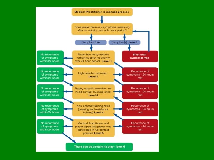 Graded Return To Play • U 8 s-U 15 s – 2 weeks rest – GRTP with 48 hours in between each stage • U 16 s-U 19 s – 1 week rest – GRTP with 24 hours in between each stage • U 20 s- – 24 hours symptom free – GRTP with 24 hours in between each stage • All of them must be seen by a Medical Professional