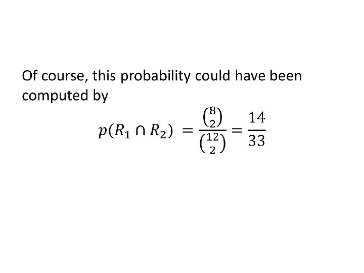 Example Suppose that an urn contains 8 red balls and 4 white balls. We draw 2 balls from the urn without replacement. If we assume that at each draw each ball in the urn is equally likely to be chosen, what is the probability that both balls drawn are red?