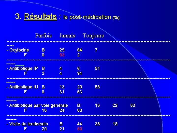 3. Résultats : l ’asepsie (%) Parfois Jamais Toujours ------------------------------------------------------ Rasage du champ opératoire B 90 ( > 20 cm) F 90 ( > 20 cm) ------------------------------------------------------ Gants (latex et/ou de fouiller) B 20 45 35 F 2 5 94 ------------------------------------------------------ Antiseptique B 1 2 96 (Hibitane) F 1 2 98 (Hibitane) ------------------------------------------------------ Champs B 10 72 18 F 12 65 23 ------------------------------------------------------