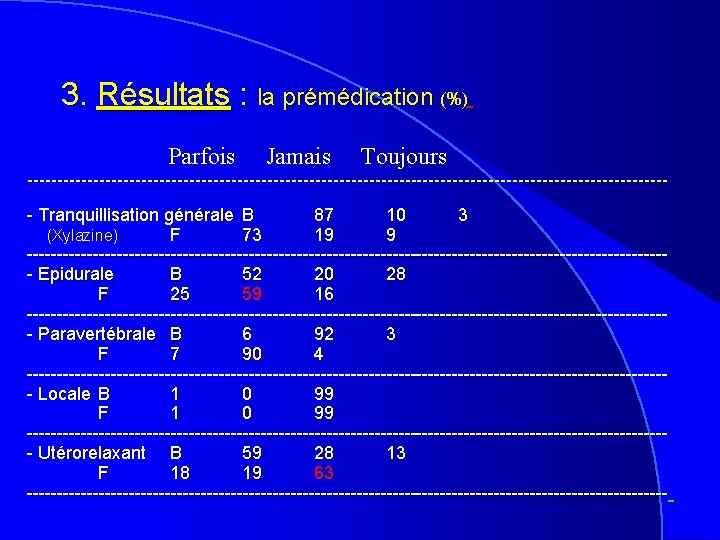 3. Résultats : la suture utérine (%) --------------------------------------------------------------------------------------------------------------- Utilisation systématique d ’une pince utérine B 62 F 43 ---------------------------------------------------------- Double (vs simple) suture de la paroi utérine B 64 F 86 ---------------------------------------------------------- Si suture unique Simple Lembert Cushing (50 % perforante) B 31 34 24 F 35 29 29 - Si suture double 1 er surjet B 46 26 25 F 47 24 16 - Si suture double 2ème surjet B 24 34 40 F 28 32 34 ----------------------------------------------------------- Matériel de suture utérine CP CC SR B 70 25 5 F 73 4 23