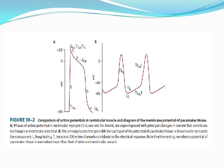 Pacemaker potentials �Rhythmically discharging cells have a membrane potential that, after each impulse, declines to the firing level. Thus, this Prepotential pacemaker potential triggers the next impulse �At the peak of each impulse, IK begins and brings about repolarization. IK then declines, and a channel that can pass both Na+ and K+ is activated. Because this channel is activated following hyperpolarization, it is referred to as an “h” channel; however, because of its unusual (funny) activation this has also been dubbed an “f” channel �As I h increases, the membrane begins to depolarize, forming the first part of the prepotential. Ca 2+ channels then open