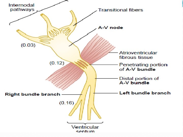 �The A-V bundle passes downward in ventricular septum from 5 -15 mm dividing into left and right bundle branches. �Left bundle branch gives of anterior fascicle and posterior fascicle �Purkenji fibers penetrate the ventricular muscle �Velocity of transmission in ventricular m uscle 0. 3 - 0. 5 m/s.