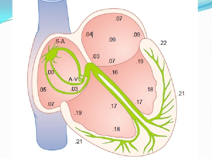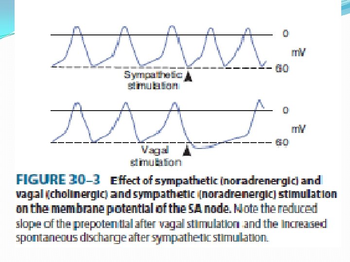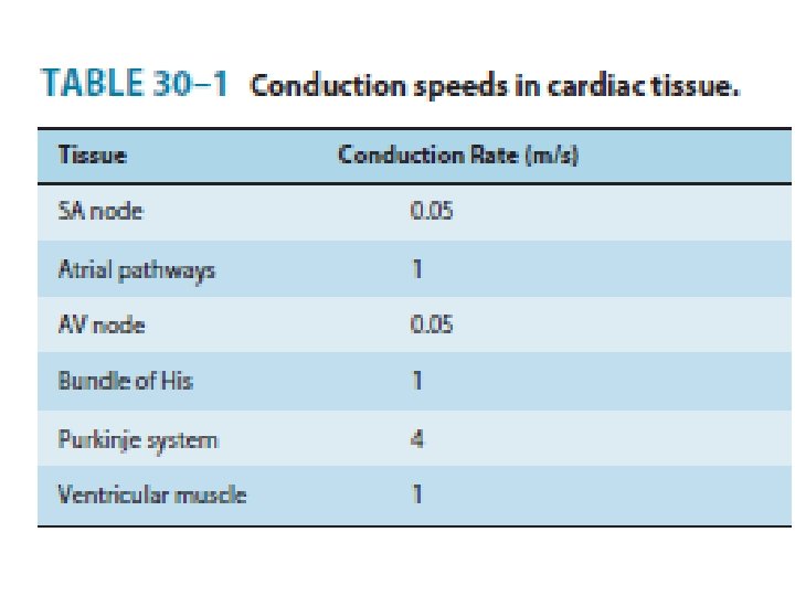 Av nodal delay �Depolarization initiated in the SA node �spreads radially through the atria, �then converges on the AV node. � Atrial depolarization is complete in about 0. 1 s. Because conduction in the AV node is slow (Table 30– 1), a delay of about 0. 1 s(AV nodal delay)occurs before excitation spreads to the ventricles