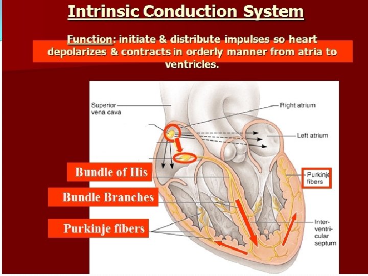 Conduction System of the Heart � SA node: sinoatrial node. The pacemaker. � Specialized cardiac muscle cells. � Generate spontaneous action potentials (autorhythmic tissue). � Action potentials pass to atrial muscle cells and to the AV node � AV node: atrioventricular node. � Action potentials conducted more slowly here than in any other part of system. � Ensures ventricles receive signal to contract after atria have contracted � AV bundle: passes through hole in cardiac skeleton to reach interventricular septum � Right and left bundle branches: extend beneath endocardium to apices of right and left ventricles � Purkinje fibers: � Large diameter cardiac muscle cells with few myofibrils. � Many gap junctions. � Conduct action potential to ventricular muscle cells (myocardium)
