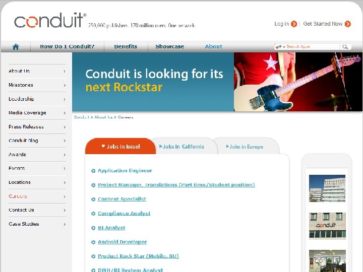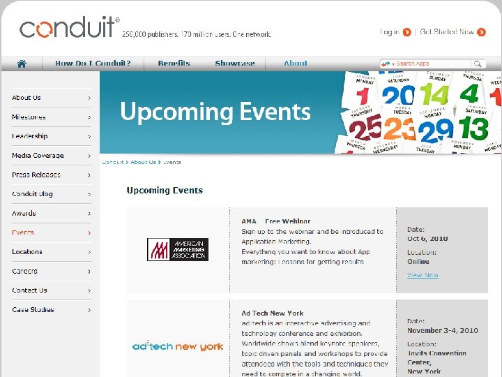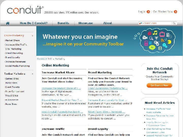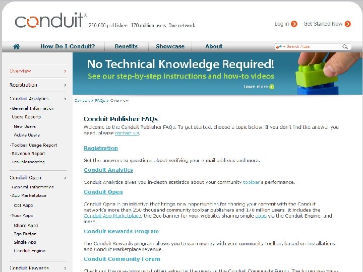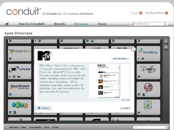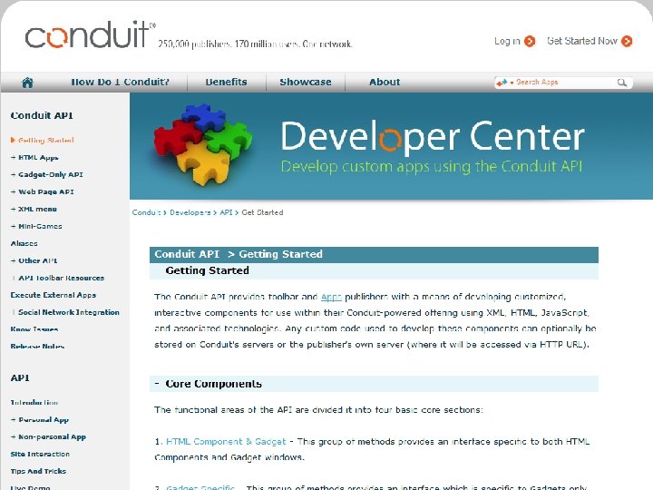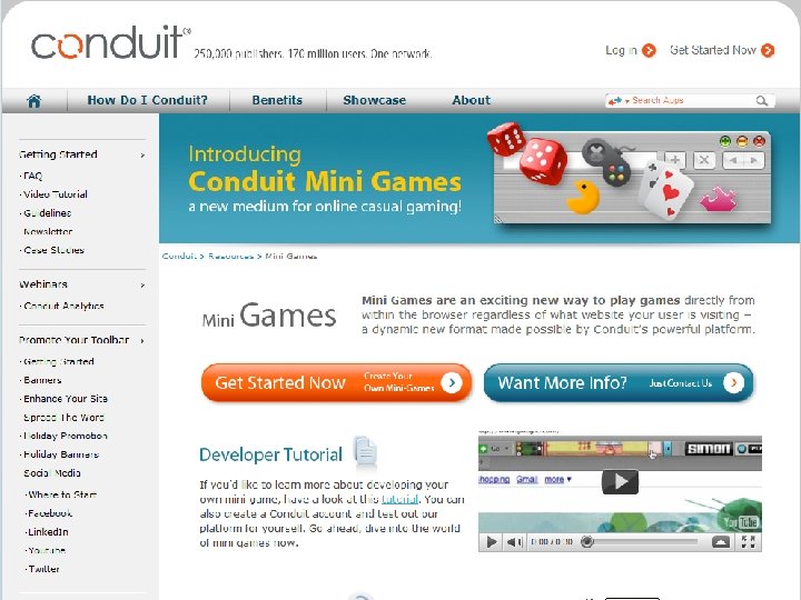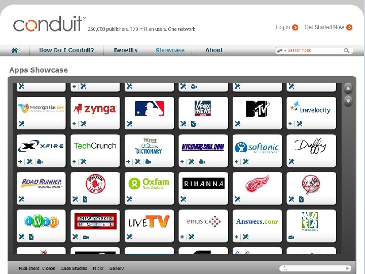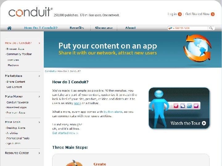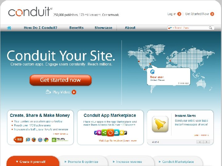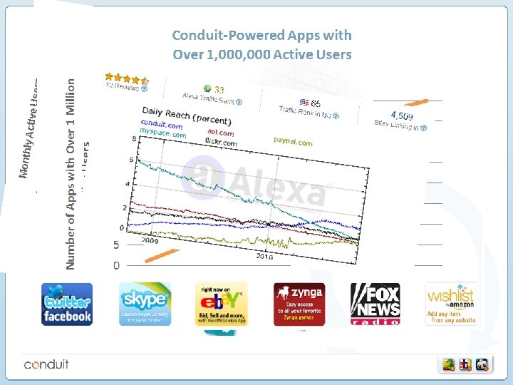1 st year 2005 2007 2006 2008 2009 2010 • Conduit launches its SAAS platform (U. S Patent 7, 529, 766) • For the 1 st time long tail publishers build components and offer them within a toolbar to their users • Following requests from the field Conduit offers community functionality, RSS & predefined components • Solution is localized to more than 30 languages New Daily Users Monthly Active Users 9, 000 1 M