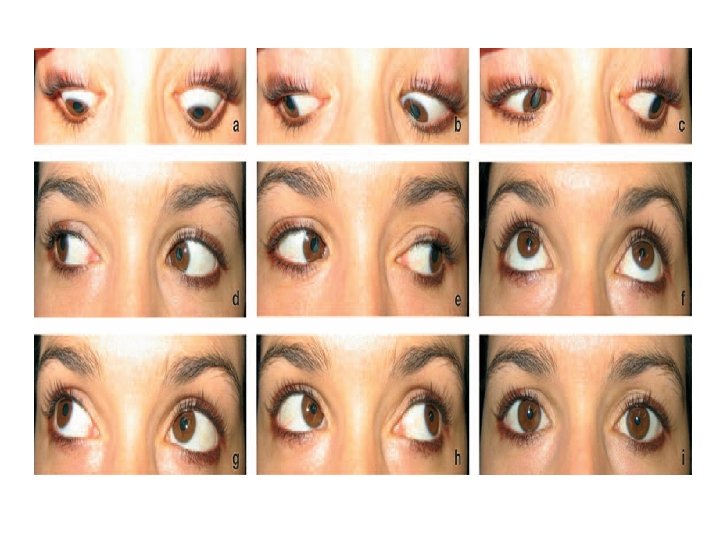 3. Paralysie du III: ● Ptôsis (qui peut masquer la diplopie). ● Œil en divergence, tête tournée du côté sain. ● Abolition de l’adduction, de l’élévation et de l’abaissement. ● Diplopie augmentée dans ces champs d’action. ● Mydriase aréflexique. ● Paralysie de l’accommodation. ● Elle est rarement totale et peut être limitée soit à un muscle, soit simplement intrinsèque.