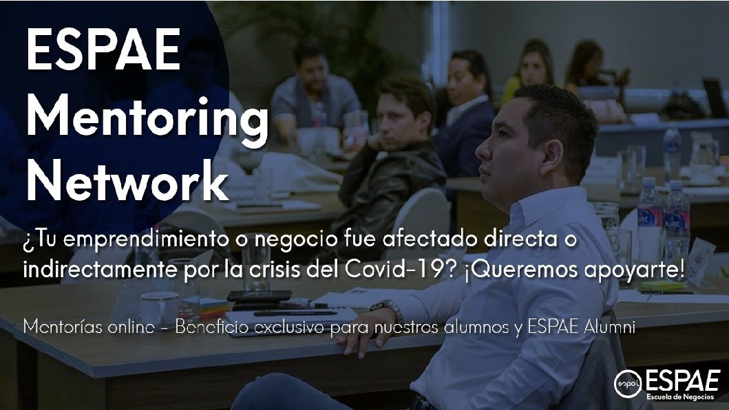 Conectando experiencias para afrontar los desafíos del Covid-19 Esta iniciativa busca apoyar a los alumnos y graduados de ESPAE, cuyos emprendimientos o empresas han sido afectados directa o indirectamente por la crisis generada tras la pandemia del coronavirus, a través de mentorías virtuales que se convierten en espacios valiosos para explorar ideas sobre cómo superar diferentes problemáticas. Para los mentores de ESPAE es una oportunidad de compartir su experiencia, inspirar y brindar orientación que contribuya a que nuestros emprendedores y profesionales, enfrenten de mejor manera los desafíos que les presenta la crisis que actualmente vivimos.