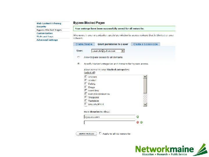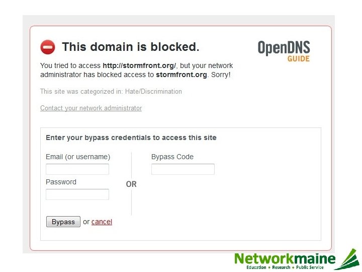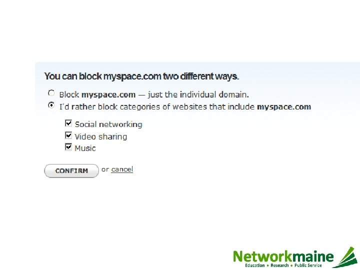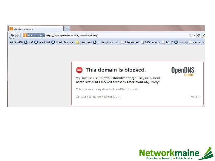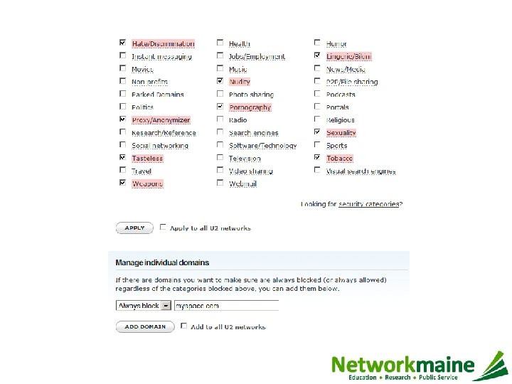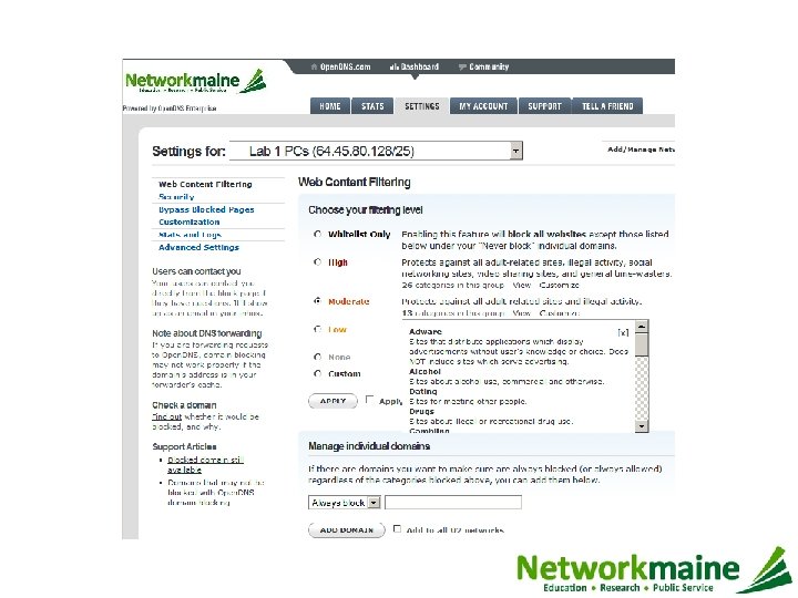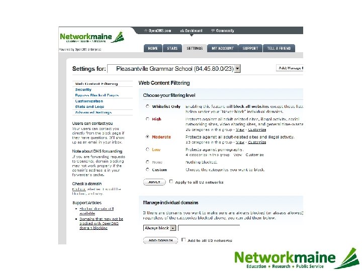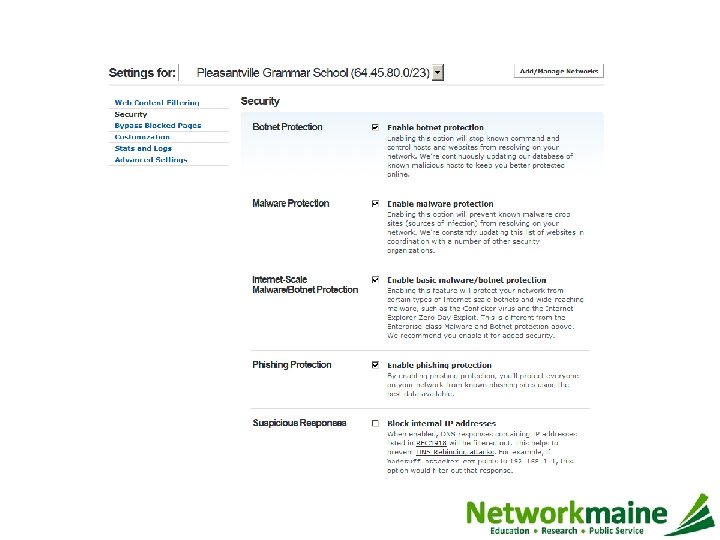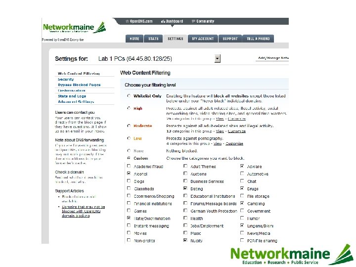 Making the transition • Set up your filter ahead of the change • Call Networkmaine during 8 -5 business hrs • Be prepared to change DNS on: – Firewalls and in-house DHCP servers – Hardcoded staff and student PC’s • We perform magic on our end to swap you over • You reboot or flush DNS on your network devices • Test it