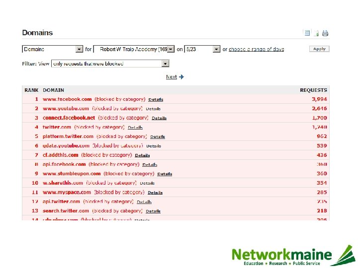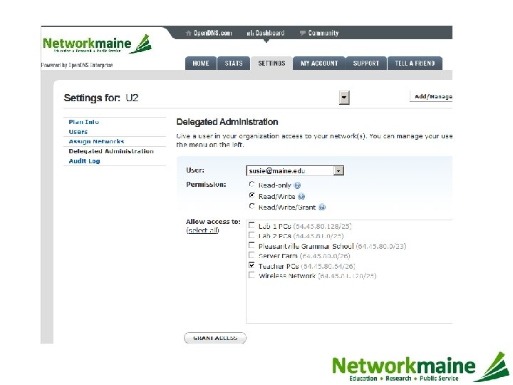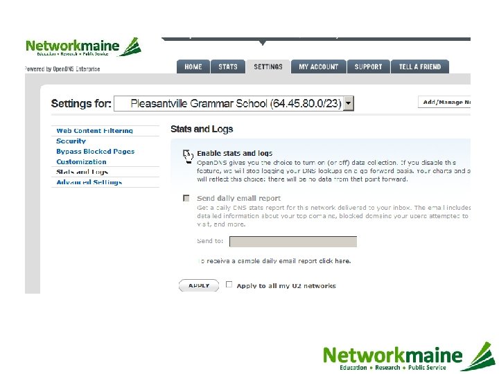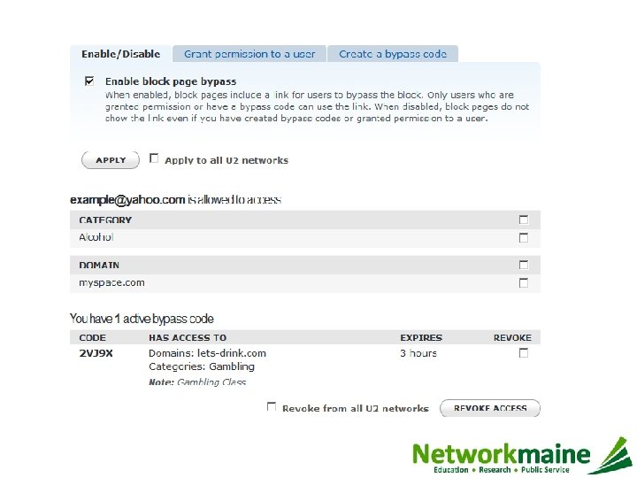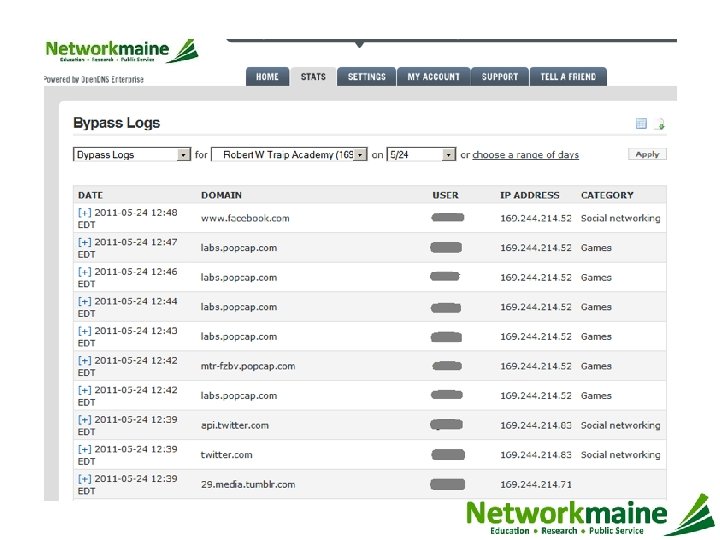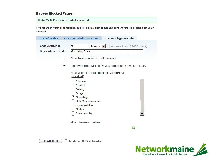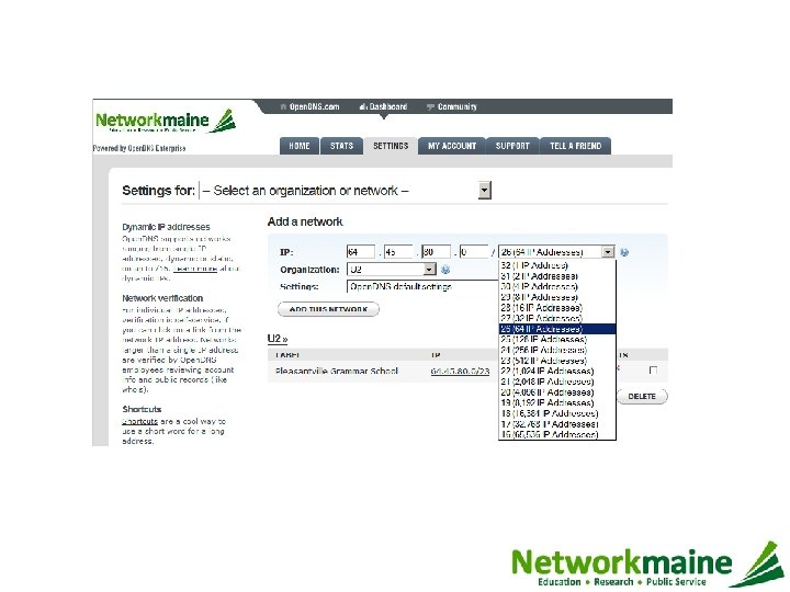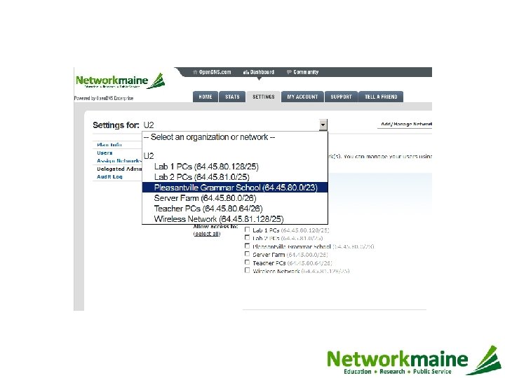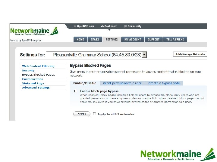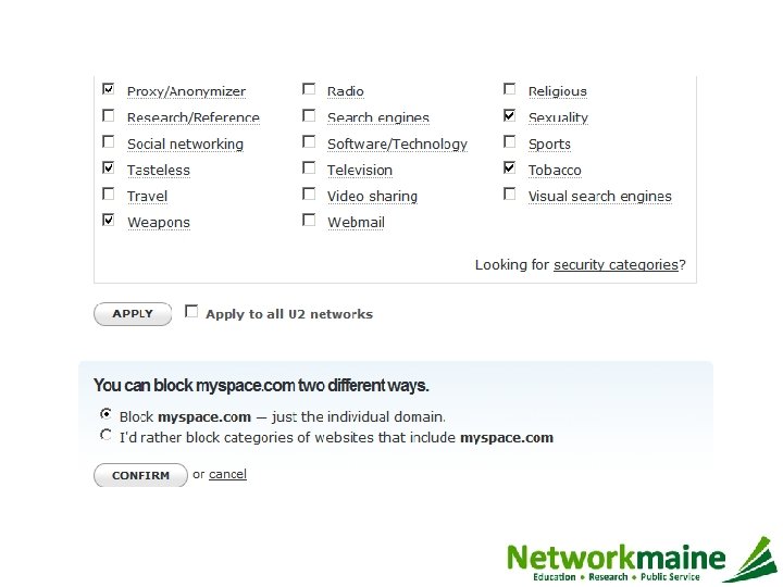Making the transition • Set up your filter ahead of the change • Call Networkmaine during 8 -5 business hrs • Be prepared to change DNS on: – Firewalls and in-house DHCP servers – Hardcoded staff and student PC’s • We perform magic on our end to swap you over • You reboot or flush DNS on your network devices • Test it