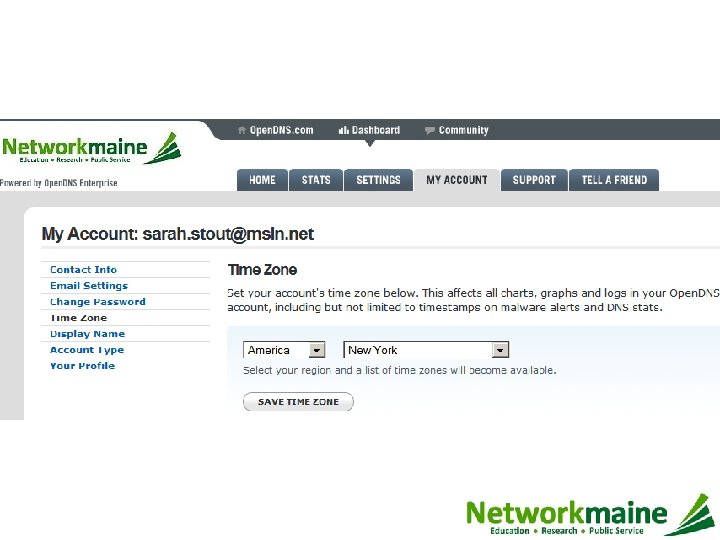 Logging in and initial setup • Logging in – http: //filter. networkmaine. net – Username = email address – Account is setup with a standard default password • Change password • Set time zone
