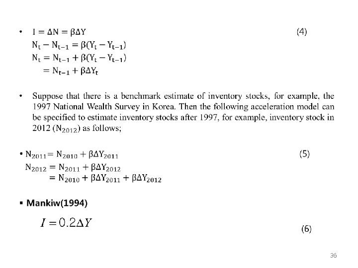 3. Estimation of Inventory Stocks Ø Harberger’s Method (1) I = Three-year moving average of investment during three normal years δ = Depreciation rate - Building(2. 5%), - Machinery and Equipment(8%) - Inventory stocks(0%) 33