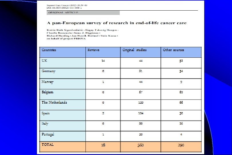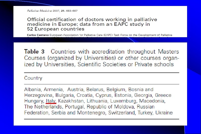 Germany l Sub-specialty since 2006 l Only need a previous specialization in any clinical subject (not, for instance, in pathology)… Institution: State Chambers of Physicians as corporations under public law, are in charge of the administration of all matters related to specialty training in Germany. A Board of Pall Med is established. Content: 1 year training time: 12 months with a training officer or 120 hours, including case seminar supervision and 40 hours training course in Palliative Medicine Final Oral examination (3 external Professors) but depends the region l l l Elsner, F. Personal communication, Jan 2012