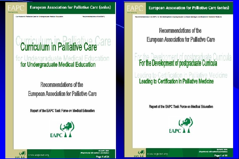 2006 Mapping levels of palliative care development: a global view (Help the Hospices and the National Hospice and Palliative Care Organization) 2007 EAPC Atlas of Palliative Care in Europe (Palliative Care Facts in Europe for 2005) 2008 EAPC Review of Palliative Care in Europe (Analysis of the development of PC in Europe between 1995 and 2005) 2008 Palliative Care in the European Union (European Parliament: Policy Department Economic and Scientific Policy) 2009 Council of Europe: Resolution 1649 “Palliative care: a model for innovative health and social policies” 2011 Mapping levels of palliative care development: a global update 2011 (Worldwide Palliative Care Alliance)