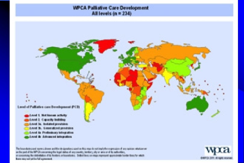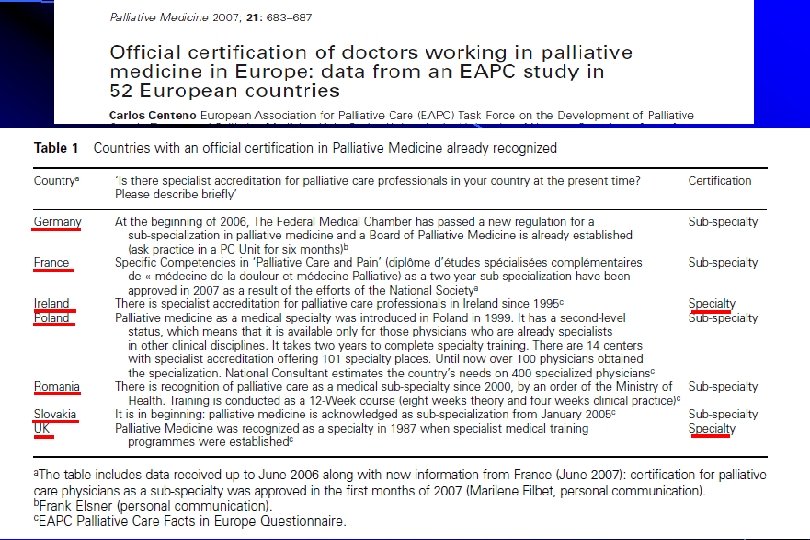 IN THE WORLD l CERTIFICATION FOR PALLIATIVE MEDICINE IN: UK, CANADA, USA, l FRANCE, GERMANY, IRELAND, POLAND, SLOVAKIA, ROMANIA, CZECH REPUBLIC, AUSTRALIA, NEW ZEALAND, HONG-KONG, SINGAPUR, TAIWANG, MALASYA, ARGENTINA, GEORGIA l l The status of Pall Med remains under-documented in the published literature 18 countries worldwide have established Pall Med as a subspecialty (or specialty) There is considerable variation in procedures of the specialty status The global categorization of Pall Care development is closely correlated with the state of Pall Med as a field of specialization at the country level