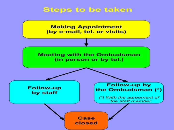What the Ombudsman does and doesn’t do Does • Objective review • Equal & confidential treatment • Fact findings and inquiries (*) • Bring concerns to appropriate office (*) Only if the staff member agrees. • • Doesn’t Disclose a person’s identify Keep records Make decisions Make policies Mandate actions Serve as an advocate Testify
