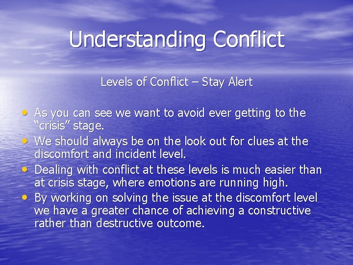 Understanding Conflict Levels of Conflict – Stay Alert • As you can see we want to avoid ever getting to the • • • “crisis” stage. We should always be on the look out for clues at the discomfort and incident level. Dealing with conflict at these levels is much easier than at crisis stage, where emotions are running high. By working on solving the issue at the discomfort level we have a greater chance of achieving a constructive rather than destructive outcome.