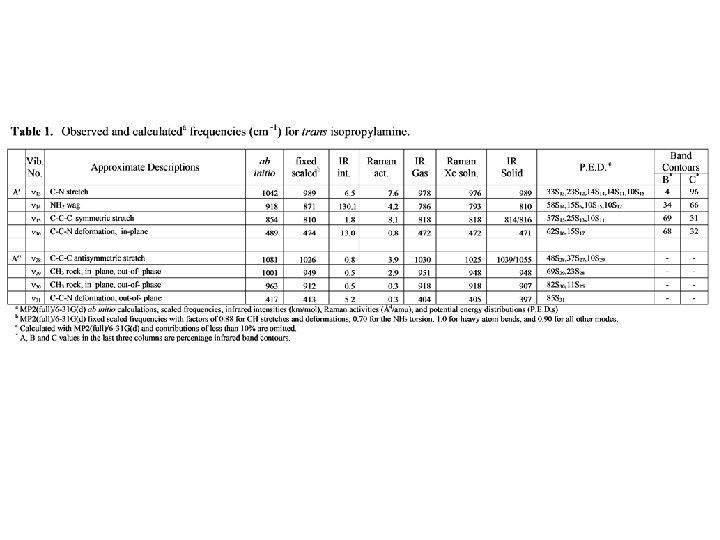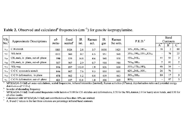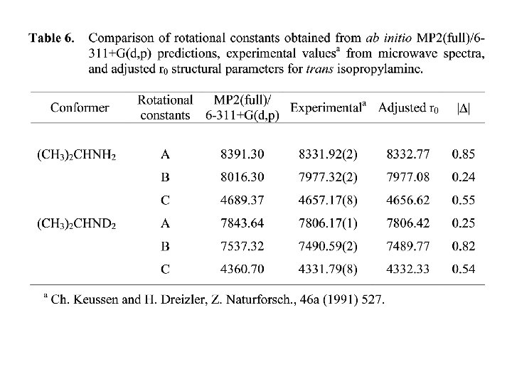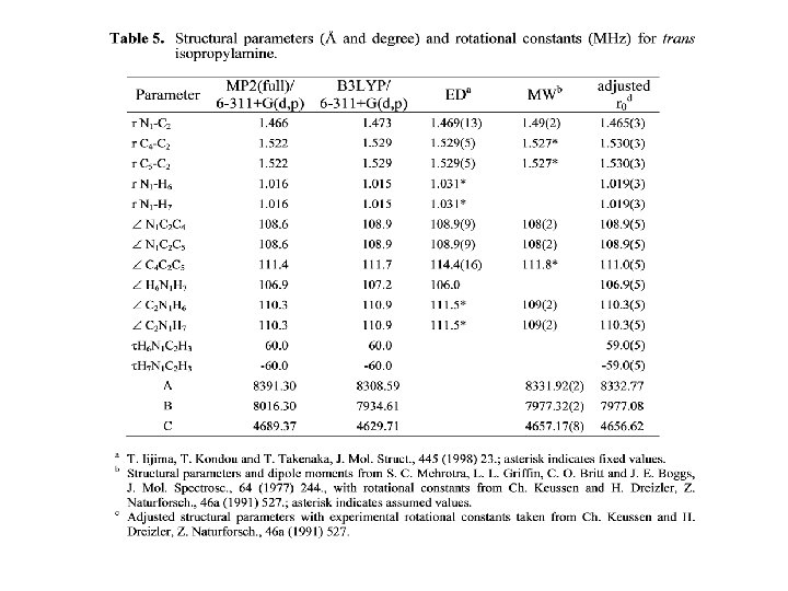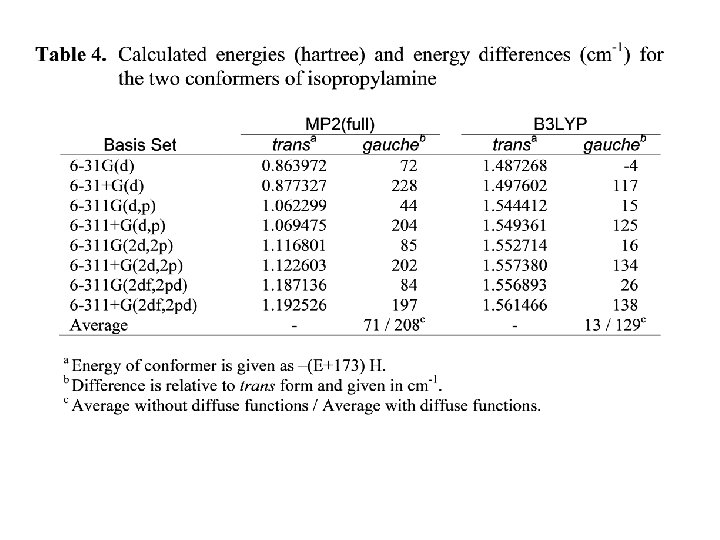 Isopropylamine, (CH 2)2 CHNH 2 • Two stable conformers • Microwave work shows trans conformer only • Trans form is predicted to be most stable conformer • energy predictions vary significantly with the addition of diffuse functions