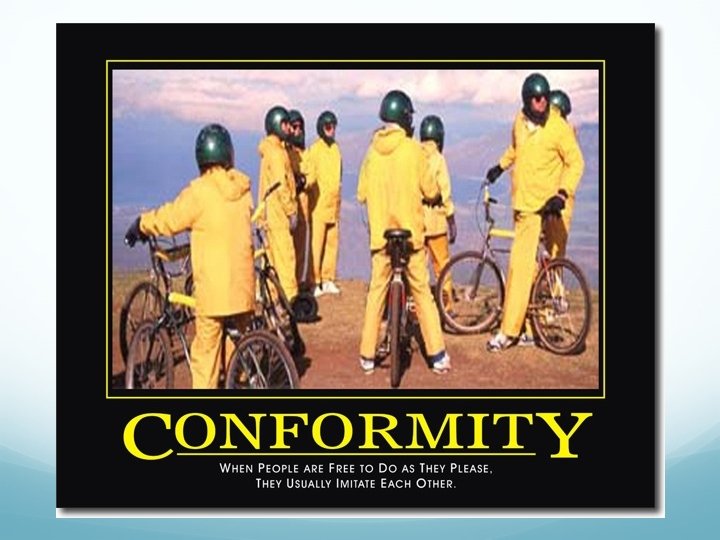 Conformity: Good or Bad? There is some tension between values associated with individualism and values associated with conformity There is inconsistency in the way our society feels about conformity: On one hand, Americans particularly value the nonconformist/individualist On the other hand (or at other times), we value the conformist/team player This also varies within different cultures, for example: A common saying in Japan is: The nail that stands out gets pounded down