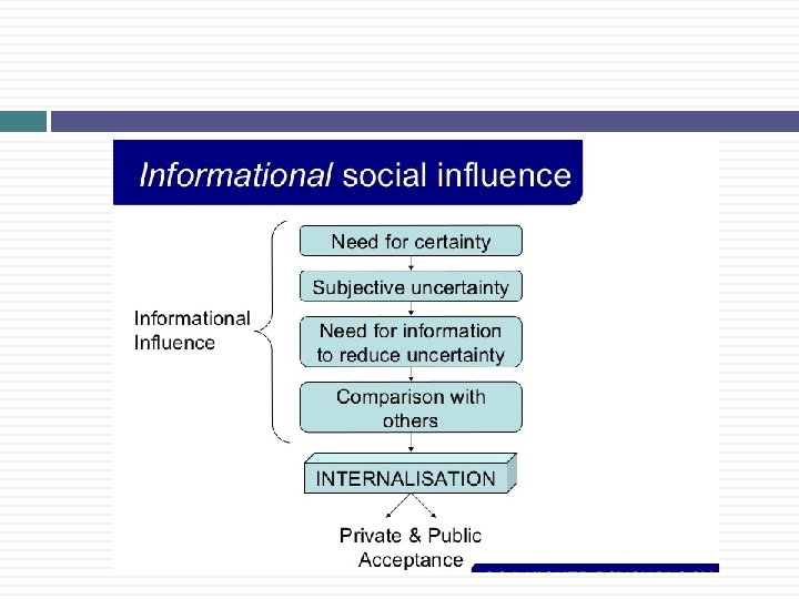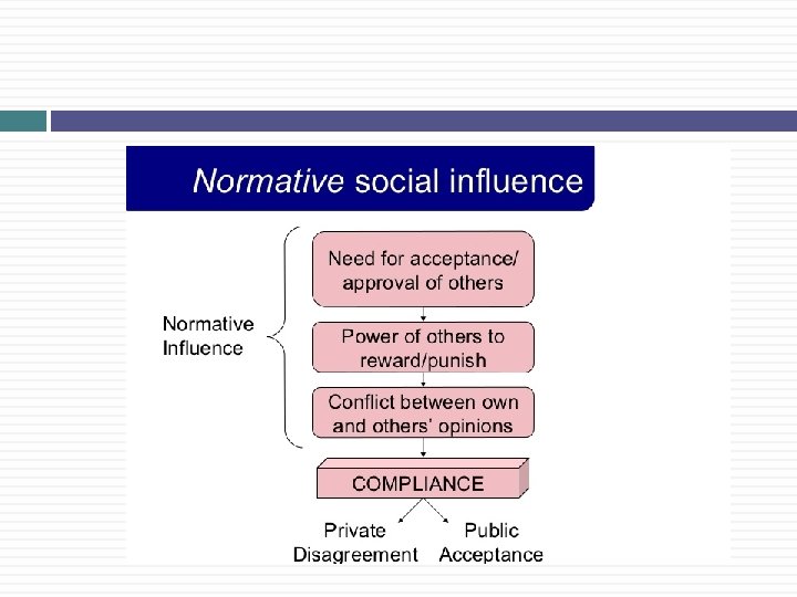 What Predicts Conformity? Conti… Makeup of group exerting the pressure experts; members are important to the individual; members are comparable to the individual; feelings of insecurity in the relationship Rewards and punishments (normative pressure) wish to avoid punishment (rejection, ridicule, embarrassment); wish to gain acceptance or love Information (behavioral modeling) sometimes the behavior of others serves as a guide to how we should behave.