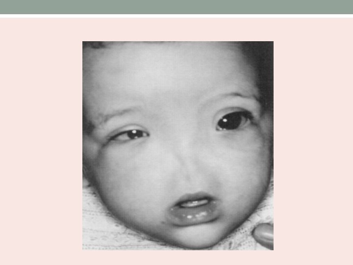 Craniofacial clefts • Ocular hypertelorism • Broad nasal root • Lack of formation of nasal tip • Anterior cranium bifidum occultum • Median clefting of nose, lip and palate. • Unilateral orbital clefting