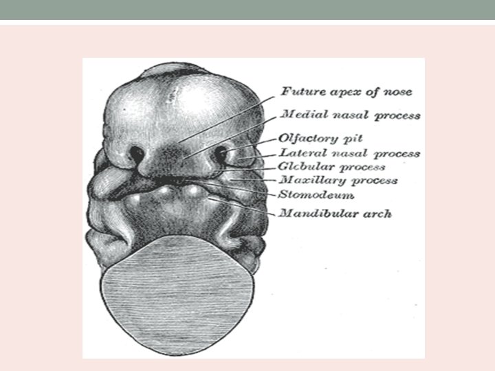 • The placode thickens and sinks into the mesenchymal tissue – olfactory pit. • Lies between the proliferating medial and lateral prominences of frontonasal process. • Medial prominences fuse to form central portion of upper lip, premaxilla and primitive nasal septum. • The primitive nasal cavity and mouth are separated by bucco nasal membrane.