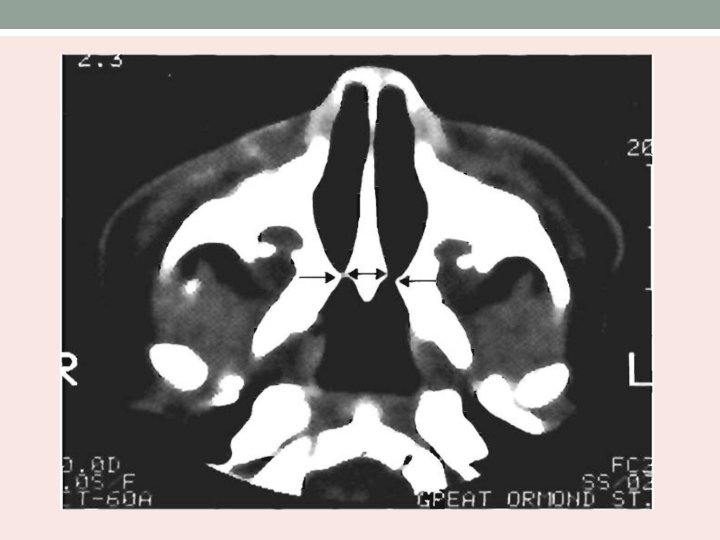 Investigations • Axial view of CT scan nose/paranasal sinus showing bony choanal atresia • CT scan – thickness of atresia