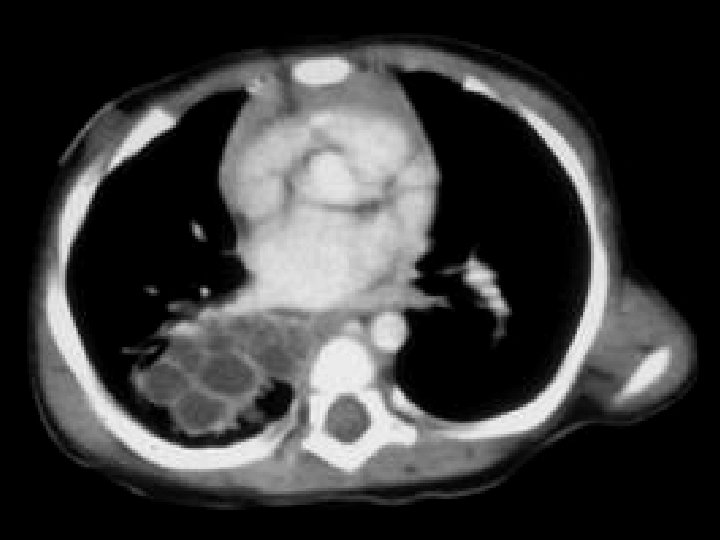Congenital cystic adenomatoid malformation • Findings: – Multilocular low attn lesion in the RLL with thin enhancing septa • ddx: – Pulmonary abscess