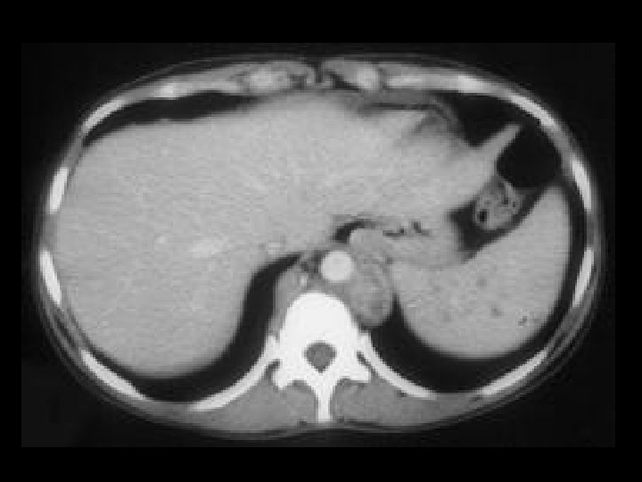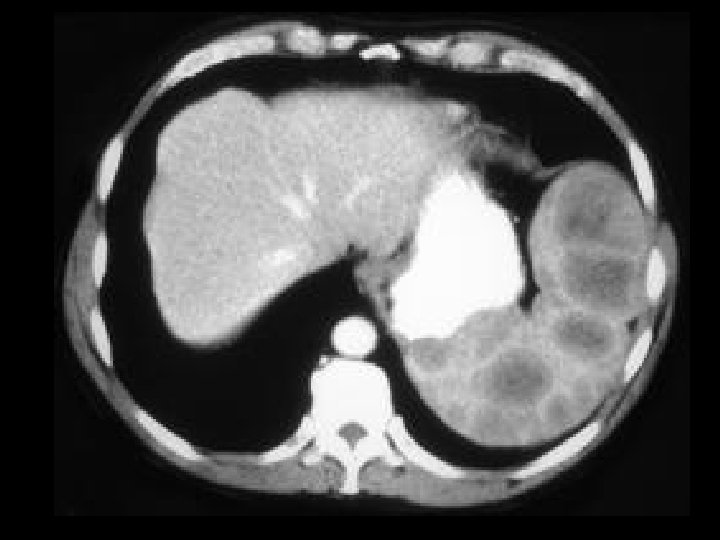 Neuroblastoma • Findings: – Large retroperitoneal mass encases the aorta and extends to the renal hilum – Peripheral enhancement and several foci of high density (? Ca 2+) • ddx: – Lymphoma – Metastatic LAN