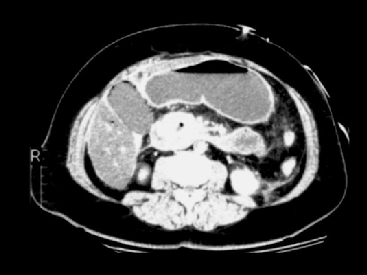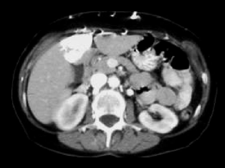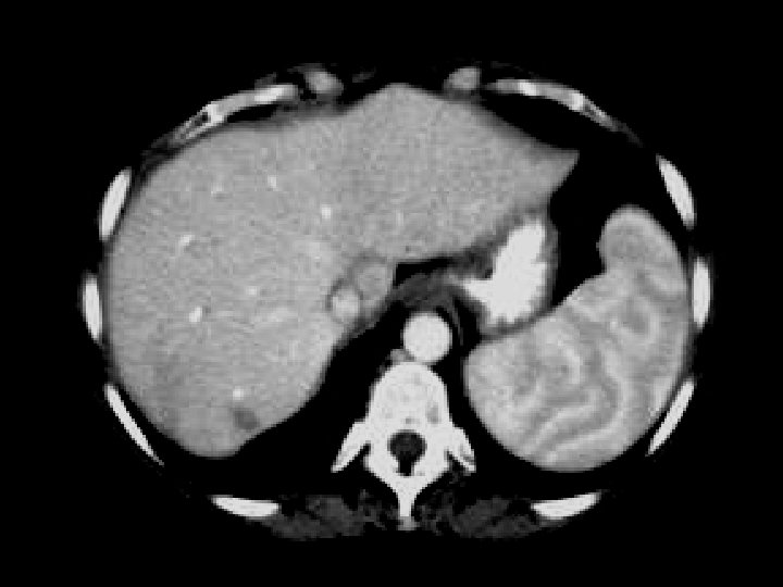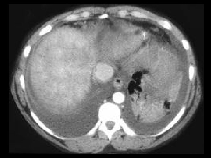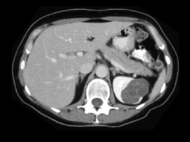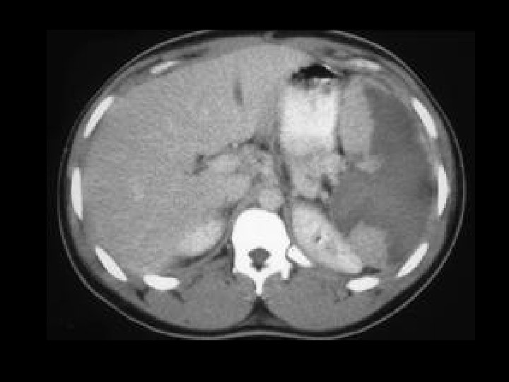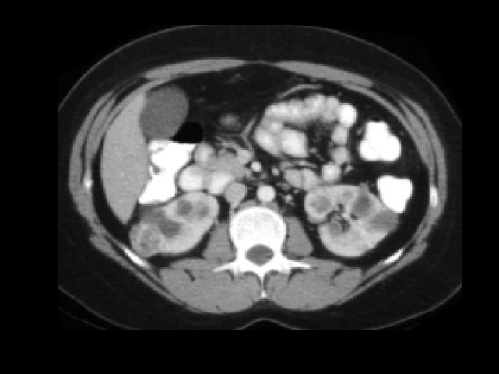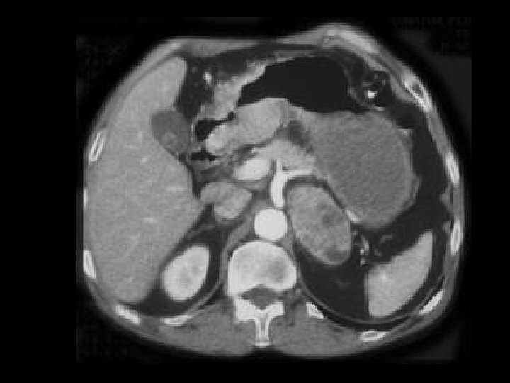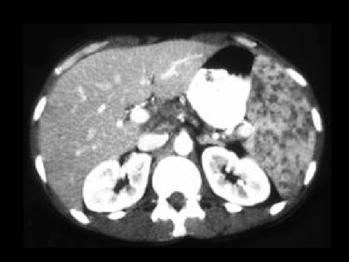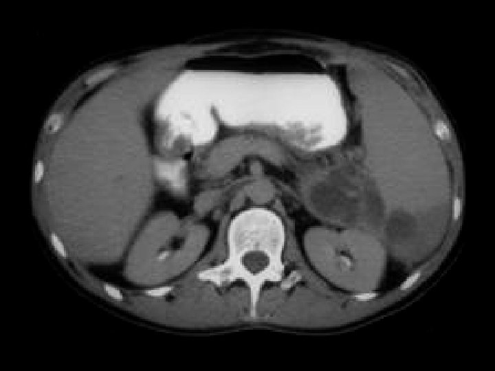 Splenic microabscesses • Findings: – Enlarged spleen contains innumerable low density lesions • ddx: – Fungal – Bacterial – Metastases – Lymphoma – Kaposi’s sarcoma – Gamma-Gandy bodies (portal hypertension) – Sarcoidosis