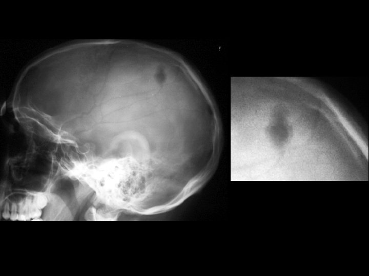 Langerhan’s cell histiocytosis • Findings: – Single geographic lytic lesion of the skull involving inner and outer table – No sclerotic margin but surrounding sclerotic reaction • ddx: – Metastasis – Osteomyelitis – Multiple myeloma (multiple) – Epidermoid (sclerotic rim)