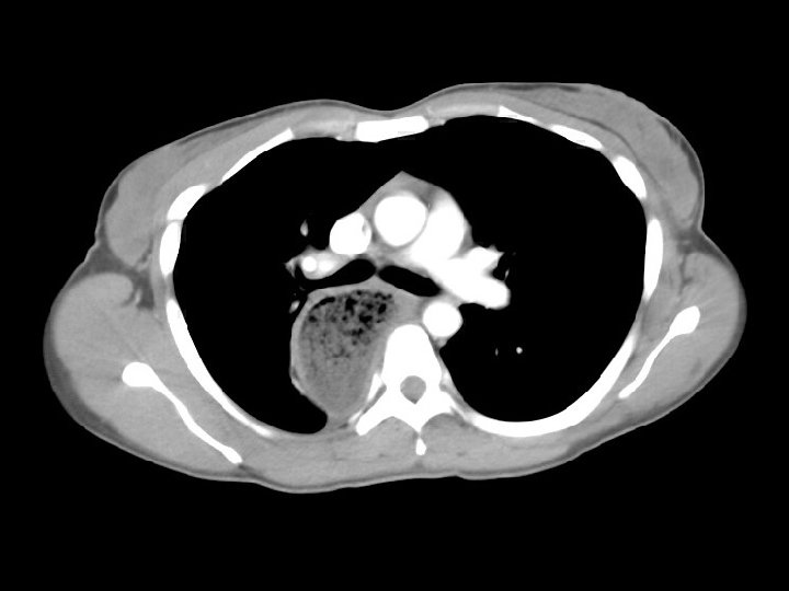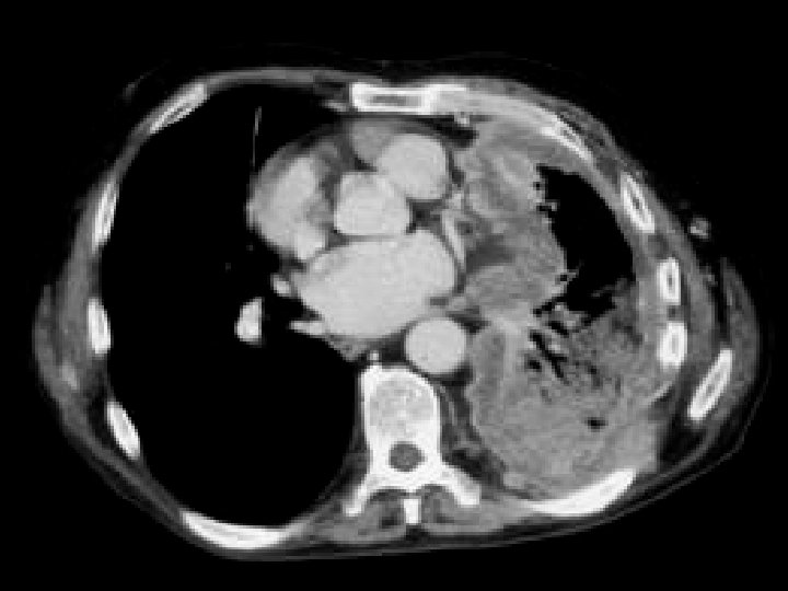 Malignant mesothelioma • Findings: – Encasement and compression of left lung by enhancing soft tissue mass – Invasion of the posterolateral chest wall and mediastinum • ddx: – Metastases • Breast • Thymus