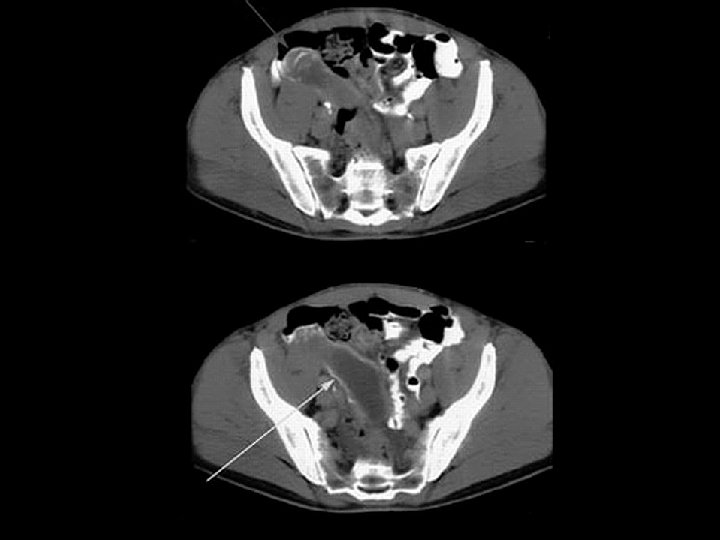 Intussusception • Findings: – Low density intraluminal mass within a small bowel loop – Contrast surrounding this mass produced the “coil spring” appearance – Associated with a lead point in adults: • Lipoma • Carcinoma • lymphoma • Meckel’s diverticulum